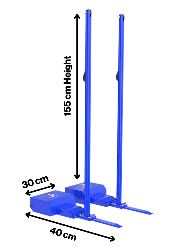 This portable volleyball post system features a single 85 kg upright with an independent counterweight for stability and two rear wheels for easy mobility. Made from reinforced steel with black powder coating for corrosion resistance, it includes a spring-assisted lift and ratchet rope tightener for secure net height adjustment from 1.98 m to 2.43 m, ideal for locations where in-ground installation isn’t possible.